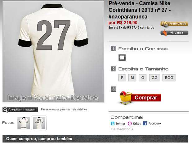 A camisa, semelhante à utilizada em partidas, tem o número 27 nas costas (em alusão à 27ª conquista do time no Campeonato Paulista) e a hashtag #naoparanunca na barra frontal. São poucas as diferenças em relação a outro modelo disponibilizado no site da loja – a mesma camisa, mas sem numeração e Também por R$ 219, o torcedor corintiano pode comprar a camisa oficial do clube com o distintivo do Mundial de Clubes de 2012 no peito.
